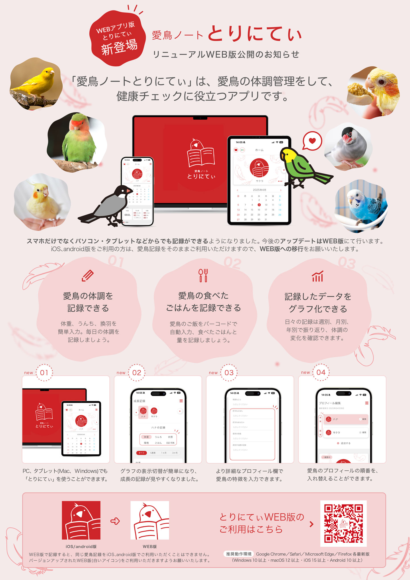 バードフードメーカー、黒瀬ペットフード様の愛鳥の健康管理アプリ「とりにてぃ」のWEBアプリケーション開発をさせていただきました。またリリース、機能紹介ページの制作およびA4版チラシの制作を行いました。アプリの特徴やWEB版ならではの機能、プレミアムプランの内容を、初めてサービスに触れる方にも分かりやすく伝えるための構成。図や画面イメージも交え、理解しやすいページを目指しました。WEBアプリは、スマートフォンに加えてPCやタブレットからも快適に利用できるよう設計。見た目や操作のしやすさにも配慮しています。デザイン面では、既存のブランドイメージやトーンを踏まえつつ、どの端末からも操作のしやすさ、アプリを通して愛鳥にもっと愛情を注いでいただけるよう制作しました。
